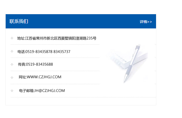地址:常州市新北區友邦商務大廈1幢16、17層  電話:0519-85101652  傳真:0519-85112595  郵編:213022  網址:www_cz-jiayue_cn.hnscbxg.com  郵箱:xiajifengaa@163.com